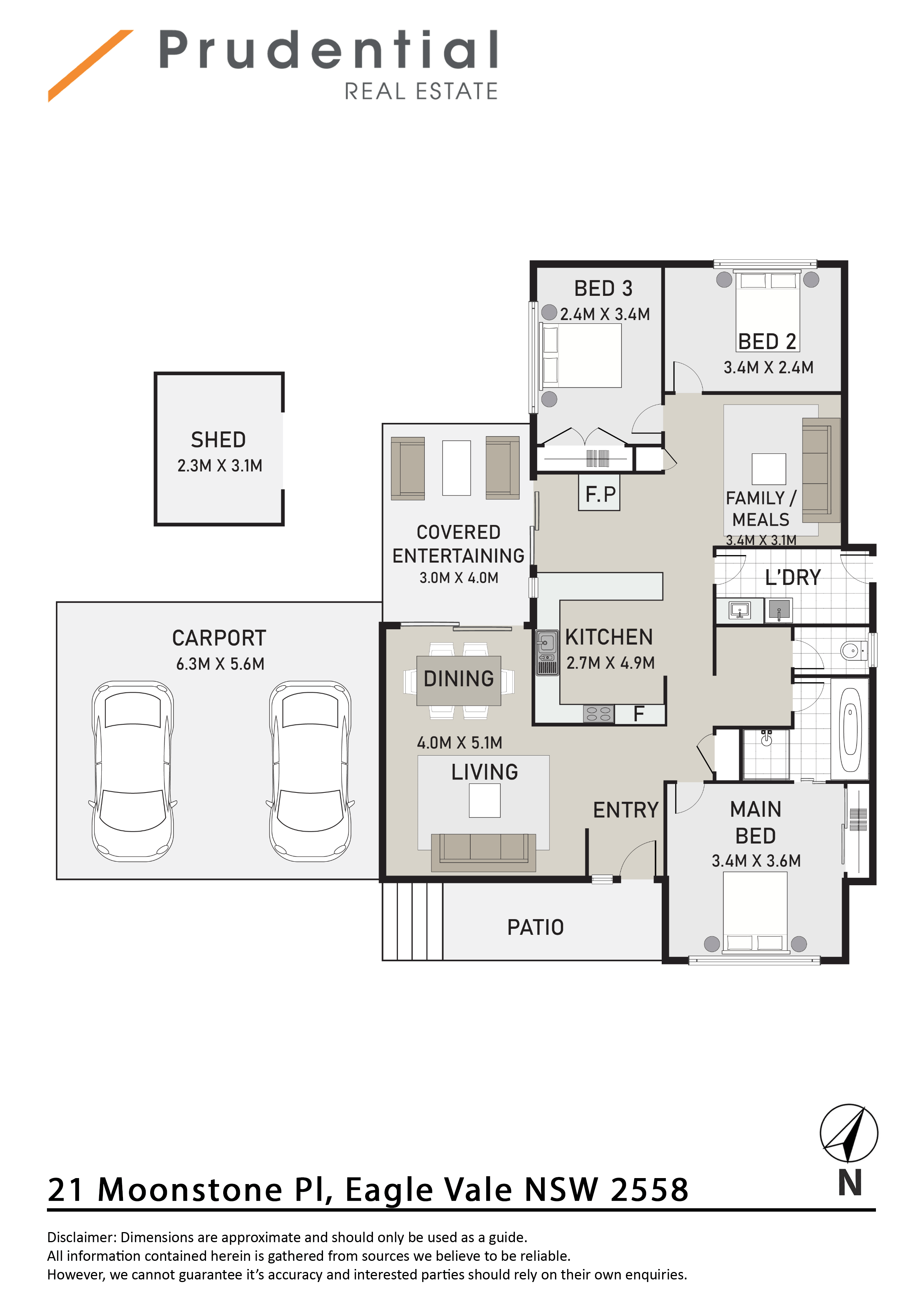 Additional features include an internal laundry, air conditioning, tiled living areas, a carport, and two storage sheds.